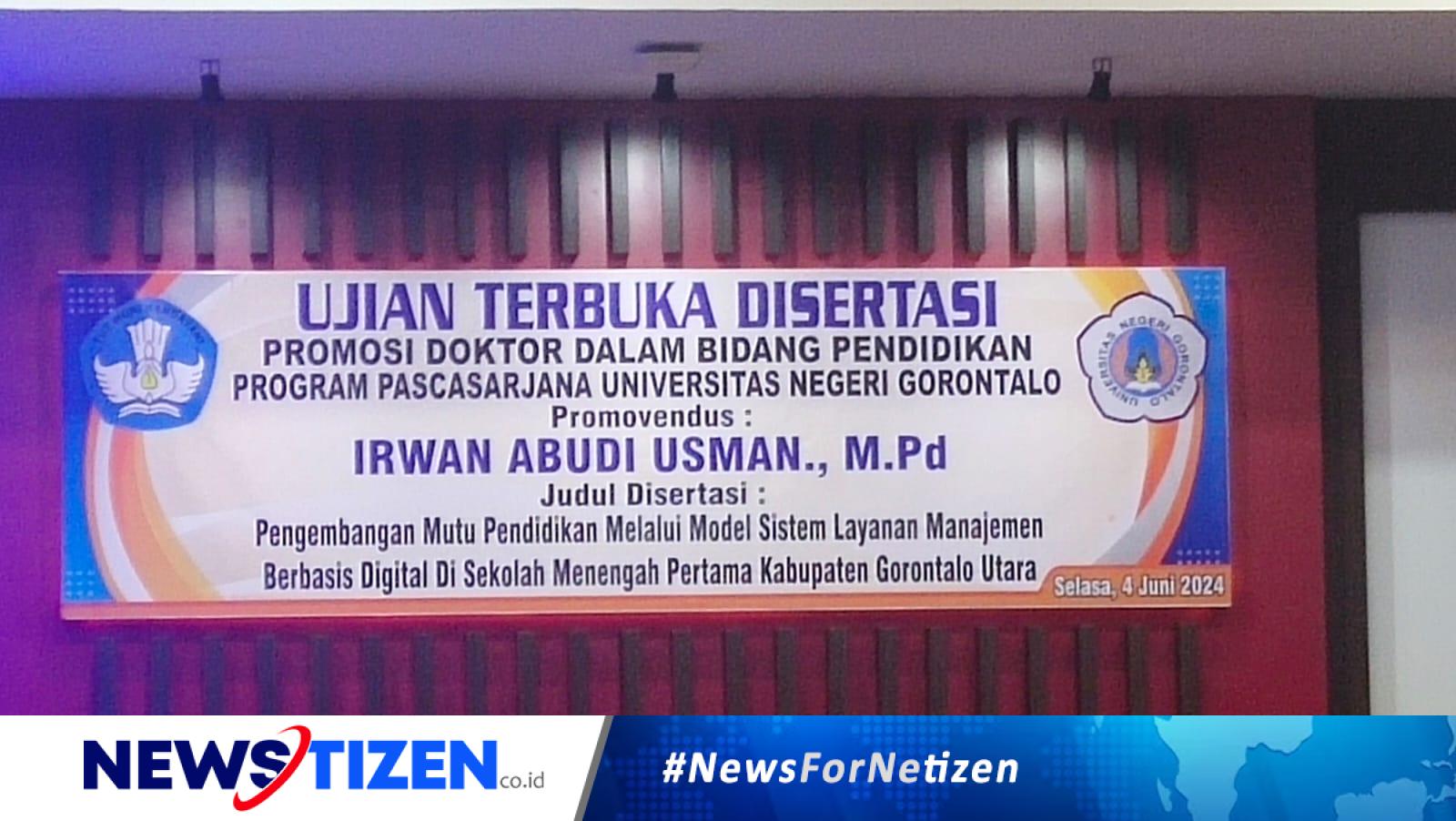 Promovendus Irwan Abadi Usman, M.Pd dengan judul Disertasi: “Pengembangan Mutu Pendidikan Melalui Model Sistem Layanan Manajemen Berbasis Digital Di Sekolah Menengah Pertama Kabupaten Gorontalo Utara”.