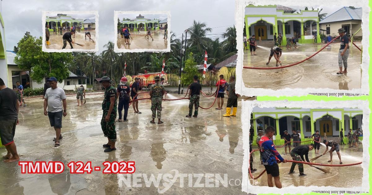 Pasiter Kodim 1314/Gorut, Lettu Inf Ida Bagus Pujana, bersama Dankisatgas Lettu Inf Supryono dan seluruh personel Satgas TMMD, bergandengan tangan dengan warga setempat membersihkan sisa-sisa material bangunan di halaman Masjid Al-Ikhlas. Pembersihan ini menjadi tahap akhir dari kegiatan pengecoran pelataran masjid yang dikerjakan dalam rangkaian program TMMD 124.