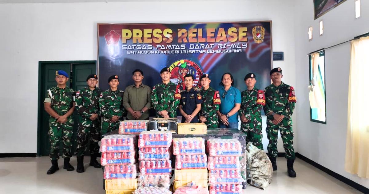 Nunukan — Upaya penyelundupan minuman keras ilegal kembali terbongkar di kawasan perbatasan Indonesia–Malaysia. Kali ini, Tim Patroli Gabungan SSK II Yonkav 13/Satya Lembuswana (SL), TDM Batt 3 RAMD, dan Satgas Gabungan Intelijen (SGI) berhasil menggagalkan peredaran ratusan miras ilegal yang diduga kuat akan diselundupkan masuk ke wilayah Indonesia melalui jalur tidak resmi di Km 7, Desa Sekaduyan Taka, Kecamatan Seimanggaris, Kabupaten Nunukan, Kalimantan Utara, Sabtu (27/12/2025).