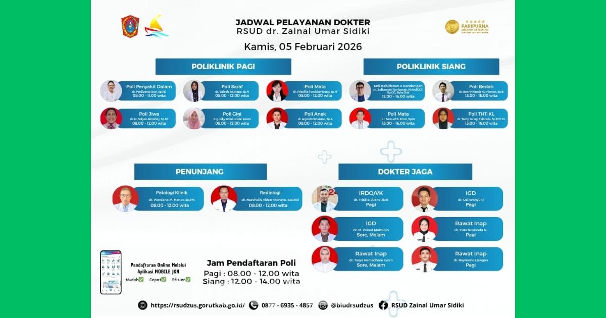 Melalui publikasi jadwal ini, RSUD ZUS kembali menegaskan perannya sebagai rumah sakit rujukan di Kabupaten Gorontalo Utara yang konsisten menghadirkan pelayanan kesehatan yang aman, responsif, dan profesional bagi seluruh lapisan masyarakat.