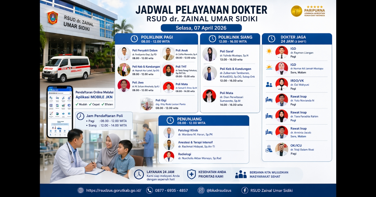 Gorontalo Utara – Momentum pagi hari kerap menjadi fase paling menentukan bagi pasien dalam memperoleh layanan kesehatan yang cepat dan tepat. Menyadari urgensi tersebut, manajemen RSUD Zainal Umar Sidiki (ZUS) menghadirkan pengaturan jadwal dokter yang lebih terstruktur untuk pelayanan Selasa, 7 April 2026.