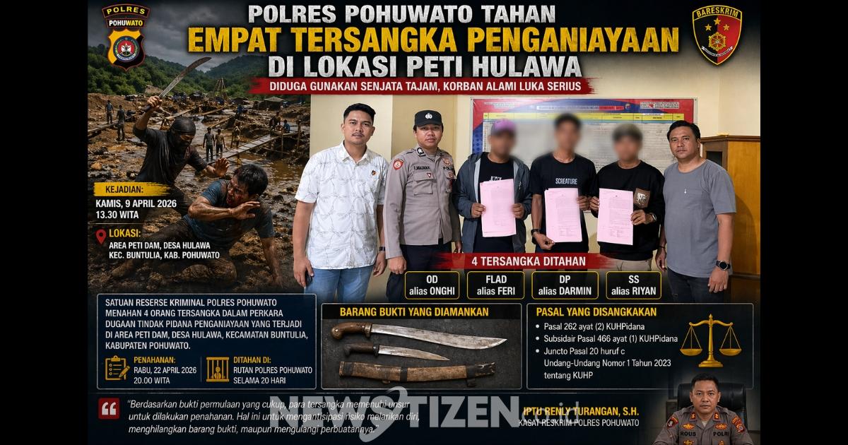 Pohuwato – Aksi kekerasan kembali mencoreng aktivitas ilegal di kawasan Pertambangan Emas Tanpa Izin (PETI) di Desa Hulawa, Kecamatan Buntulia, Kabupaten Pohuwato. Satuan Reserse Kriminal Polres Pohuwato bertindak tegas dengan menahan empat tersangka dalam kasus dugaan penganiayaan berat yang terjadi di area tambang ilegal tersebut.